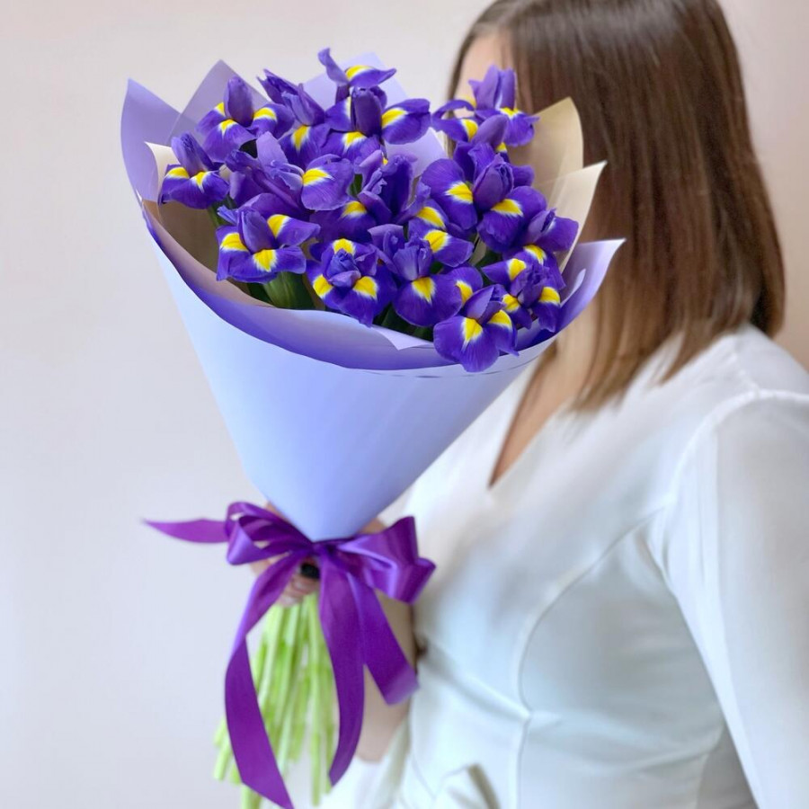 На фото букет из 19 фиолетовых ирисов. В составе: ирис 19 шт, дизайнерская упаковка 1 шт, атласная лента 1 шт, . Все цветы свежие и ароматные, букет красиво оформлен и отлично подходит для подарка. Доступна доставка цветов или самовывоз.