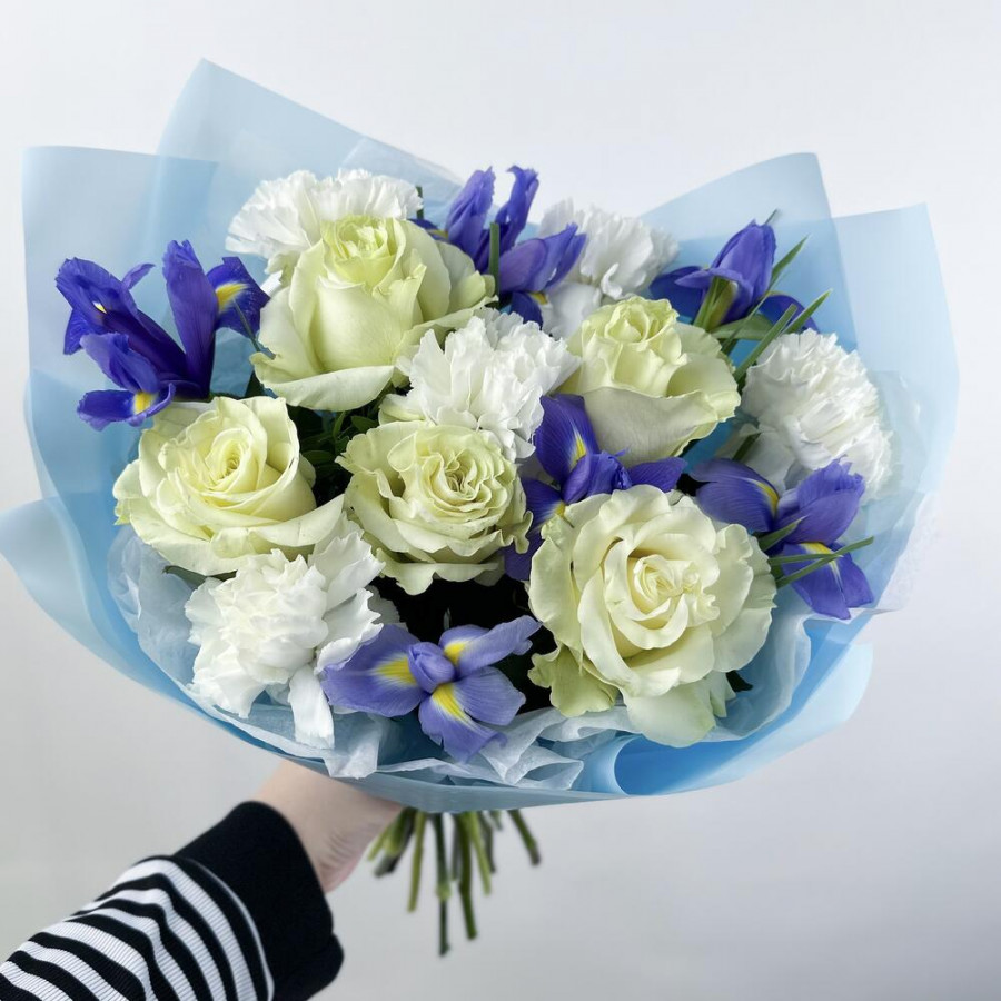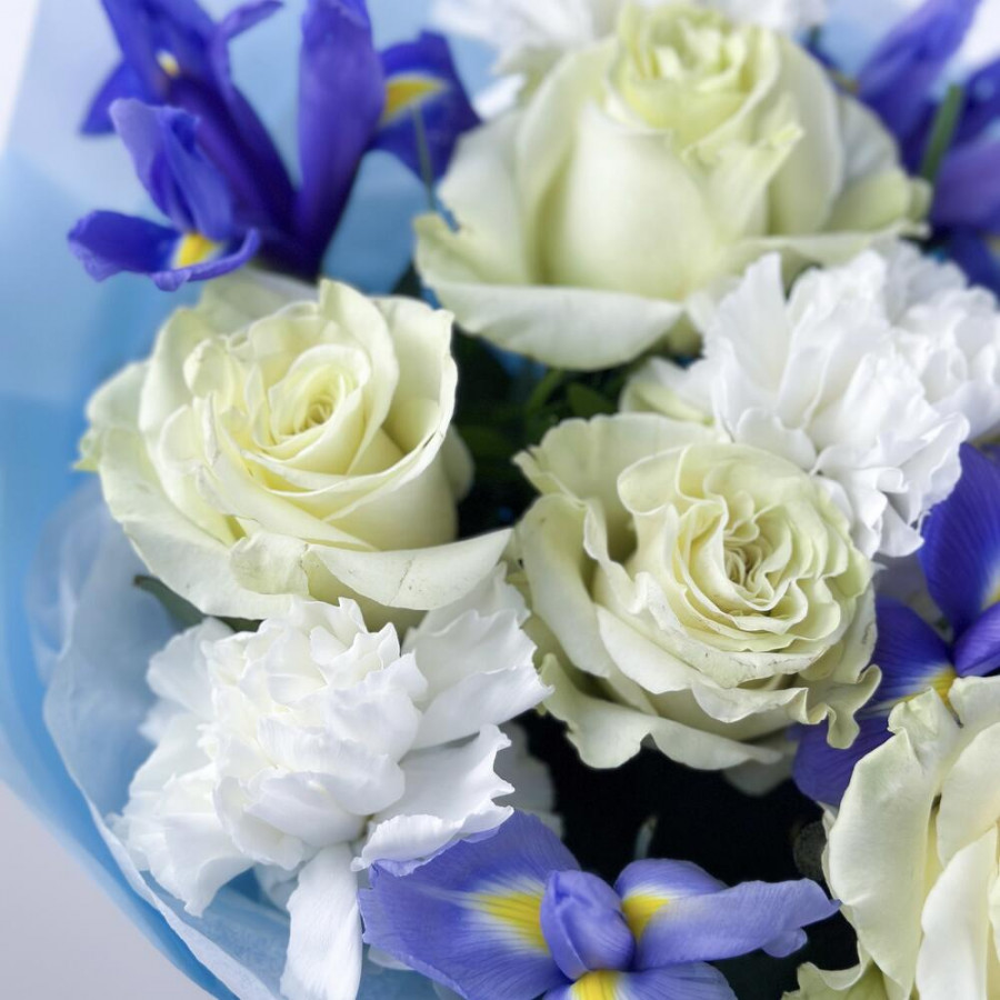 На фото букет из белых гвоздик, синих ирисов и белых роз. В составе: ирис 5 шт, роза 5 шт, гвоздика 6 шт, дизайнерская упаковка 1 шт, атласная лента 1 шт, . Все цветы свежие и ароматные, букет красиво оформлен и отлично подходит для подарка. Доступна доставка цветов или самовывоз.